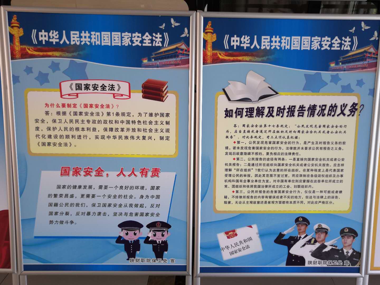 4月15日,是国家安全法颁布实施以来的第三个全民国家安全教育日。陕西财经职业技术学院为提升全院师生的国家安全意识,开展了国家安全教育日主题宣传活动。主要采取了校园网、橱窗、微信、展板及主题班会等方式进行,收到了良好效果。